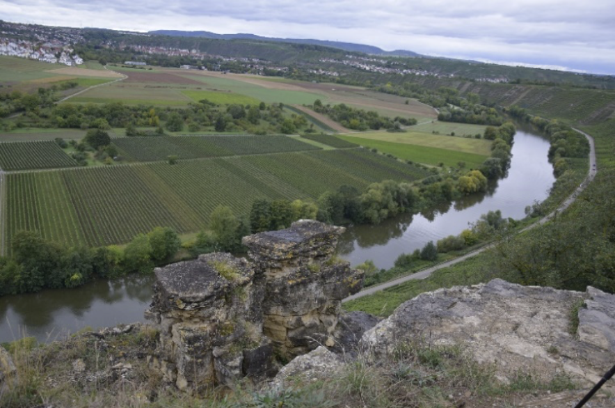 Den zweiten Busstopp gab es dann an den Ufern der Enz in Besigheim. Dort machte sich die vierzehnköpfige Wandergruppe auf den rund 15 km langen Rundwanderweg. Zum Wandern herrschte nahezu perfektes Wetter. Die landschaftlich und wegemäßig abwechslungsreiche Strecke führte über die Enz, durch Besigheim, über den Neckar hinauf zu den Felsgärten mit ihren bizarren Formen und grandioser Aussicht. Die Mittagszeit verbrachte man im Weindorf der Felsengartenkellerei in Hessigheim.